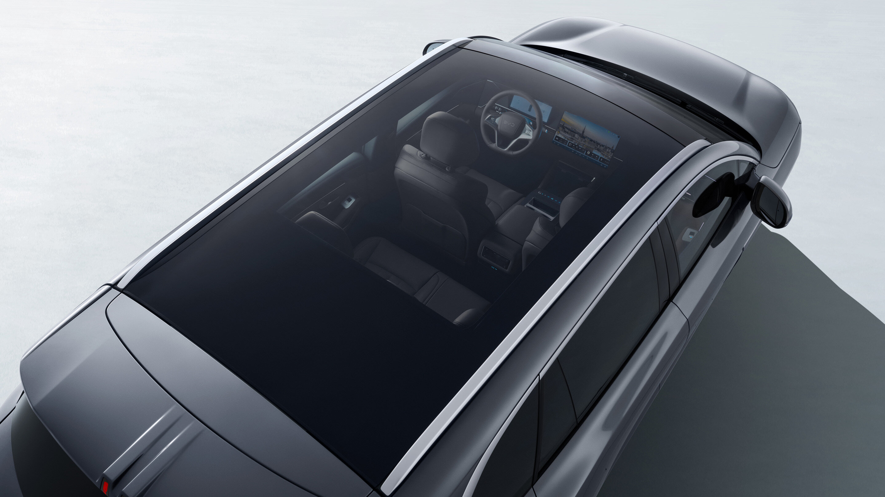 Com linhas limpas e acabamento refinado, a cortina elétrica do teto panorâmico de 2,39 m² integra-se perfeitamente ao design interno, reforçando o estilo sofisticado e moderno do veículo.