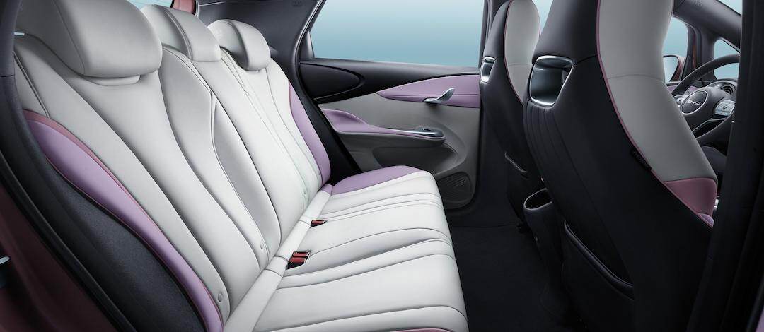 Graças a e-Platform 3.0, ao balanço dianteiro e traseiro curtos e a longa distância entre eixos, o BYD Dolphin tem uma aparência harmônica e espaçosa. O piso plano do compartimento traseiro oferece mais conforto e espaço para o passageiro do banco do meio.