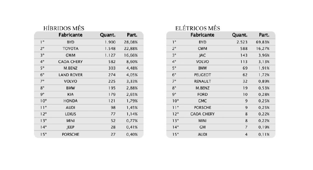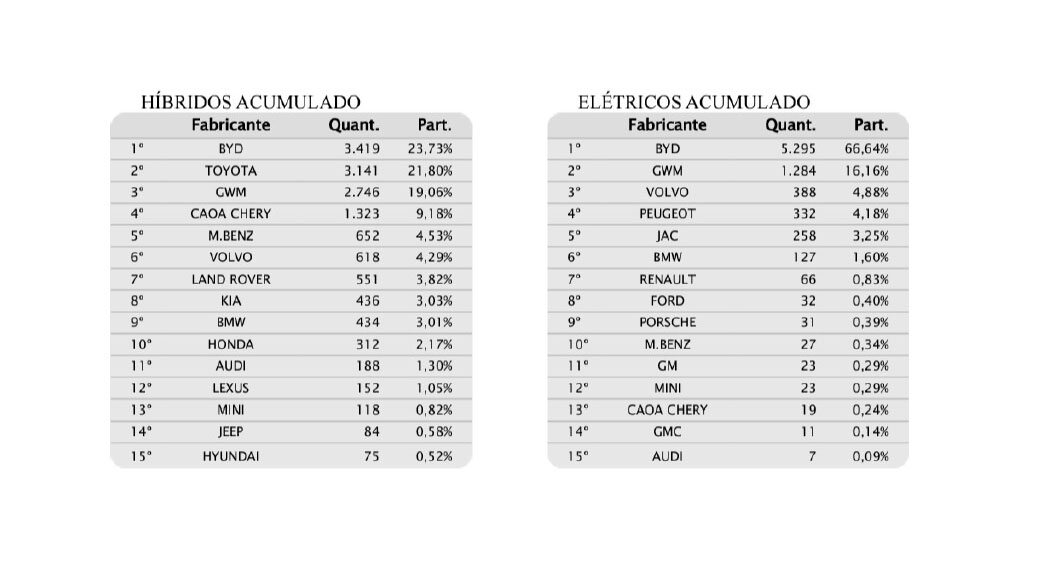 BYD lidera vendas de 100% elétricos e híbridos em 2024