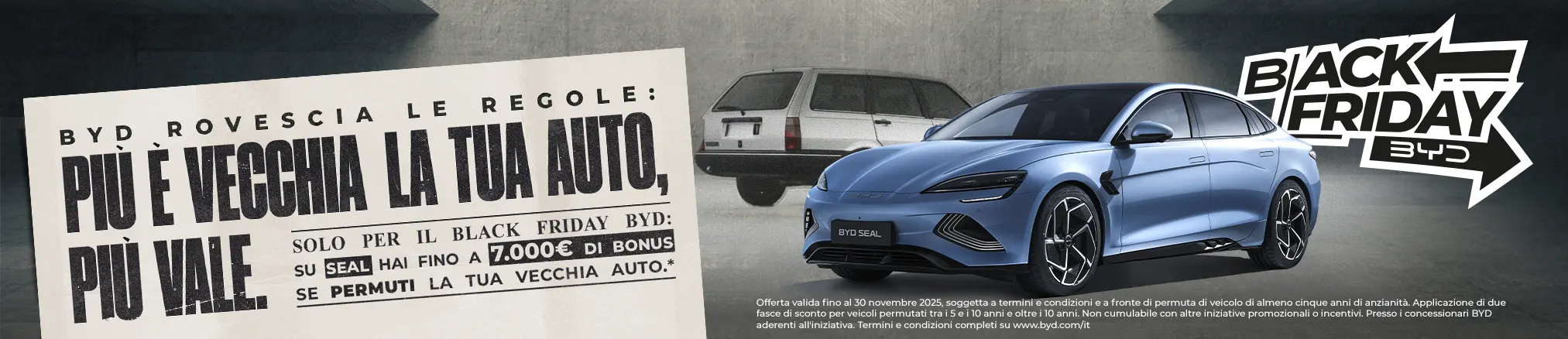 * Note legali: Offerta valida fino al 30 novembre 2025, soggetta a termini e condizioni e a fronte di permuta di veicolo di almeno cinque anni di anzianità. Applicazione di due fasce di sconto per veicoli permutati tra i 5 e i 10 anni e oltre i 10 anni. Non cumulabile con altre iniziative promozionali o incentivi. Presso i concessionari BYD aderenti all'iniziativa. Termini e condizioni complete qui
