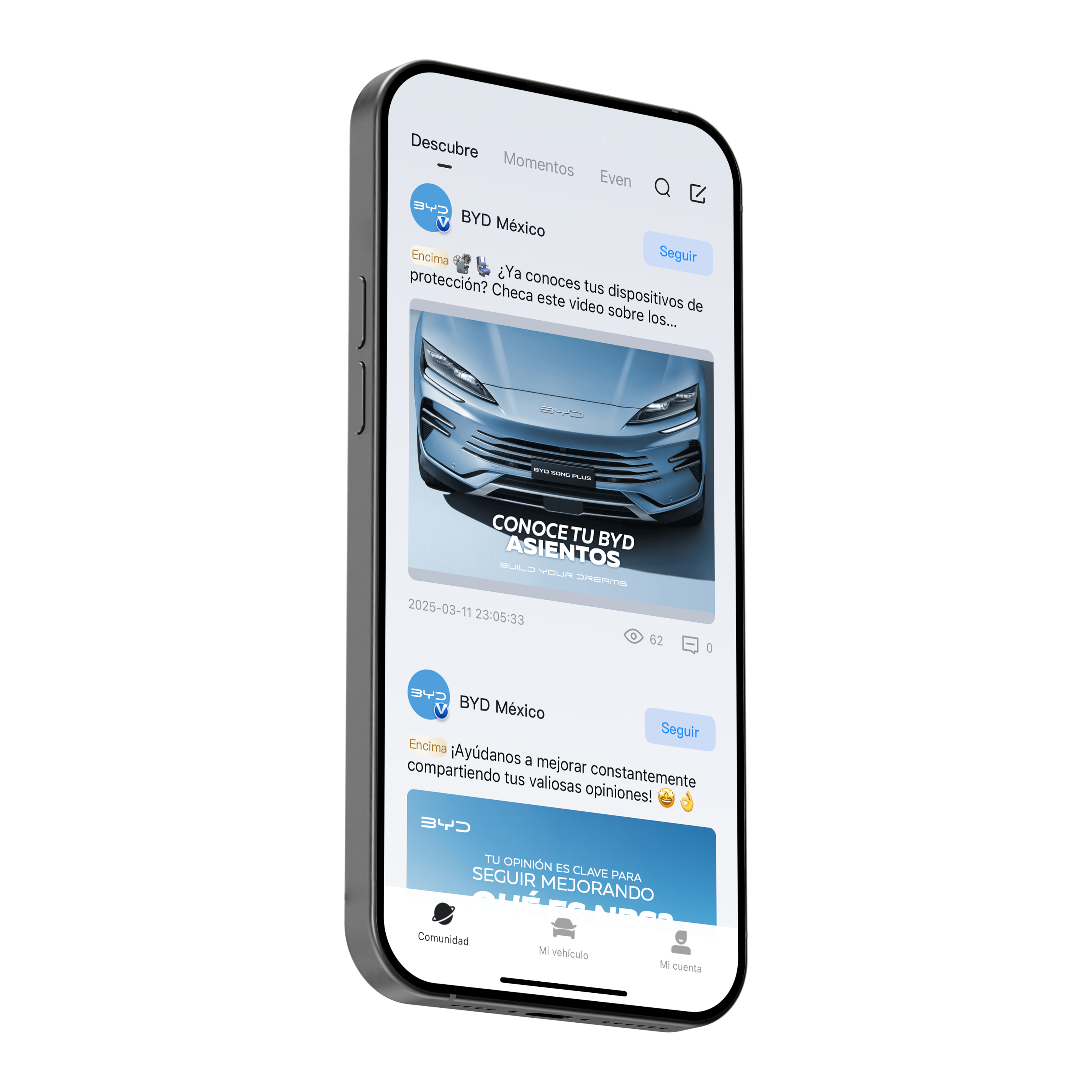 El uso de la BYD App es muy intuitivo, desplázate por los diferentes menús que hemos puesto a tu disposición. BYD App está dividida en tres principales secciones: en la parte central de la barra inferior encontrarás “Mi Vehículo”, donde podrás controlar algunas funciones de tu vehículo. En la parte izquierda de la barra inferior “Comunidad”, descubrirás todas las novedades e información acerca de los modelos BYD, así como interactuar con otros usuarios. Finalmente, en la parte derecha de la barra inferior encontrarás “Mi Cuenta”, revisa detalles y configuraciones acerca de tu usuario.